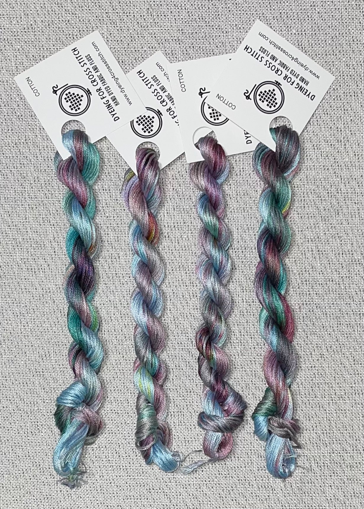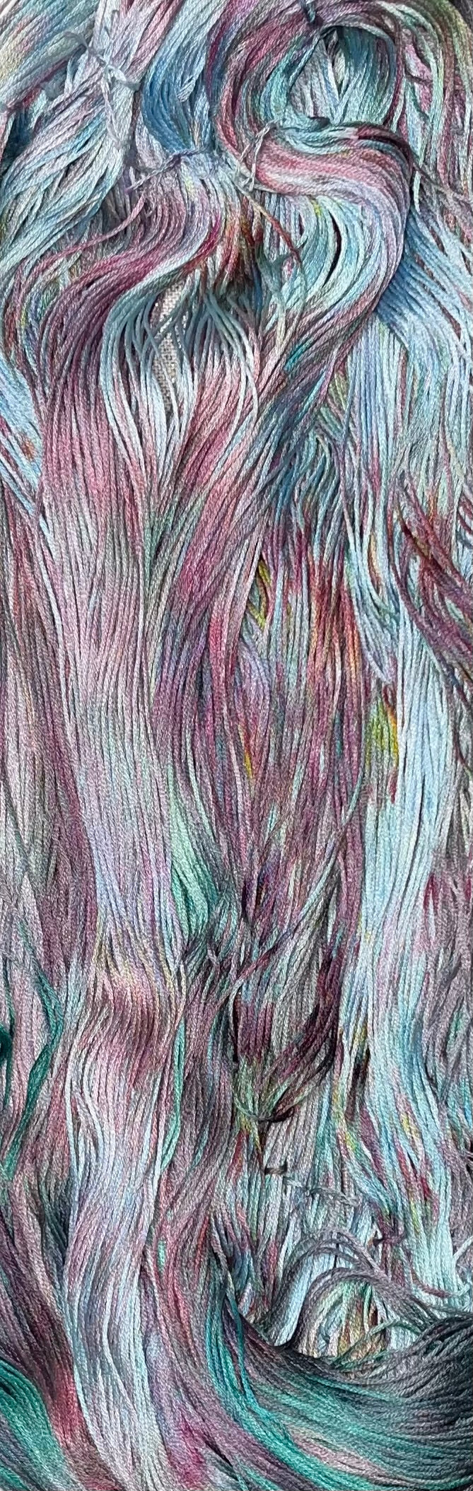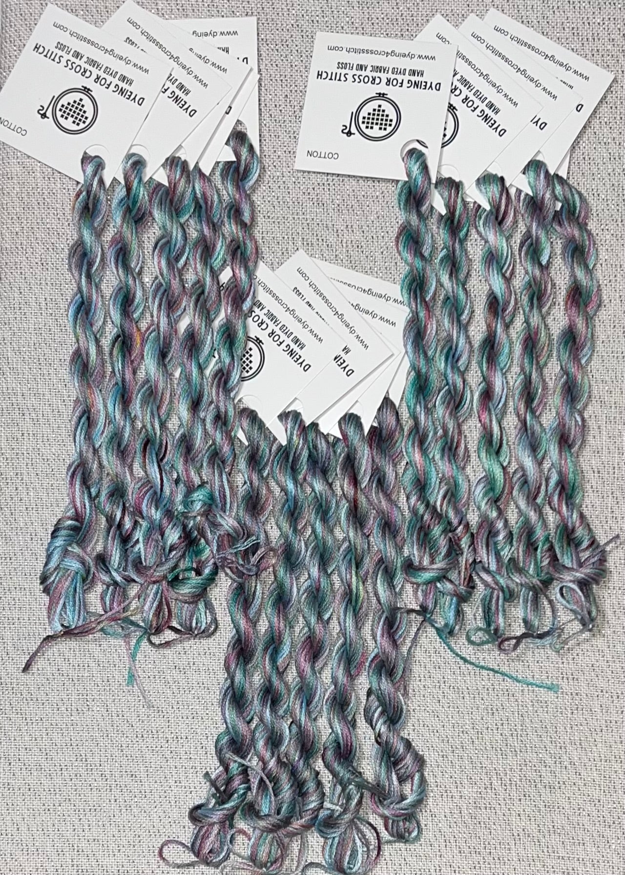 The base thread is 6-stranded white DMC embroidery floss. Each skein is unique as it is hand dyed.